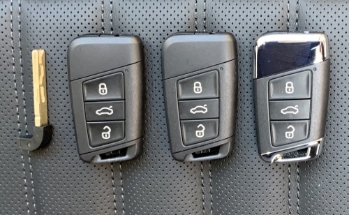 V první foto ukázce naleznete VW Golf VII r.v. 2017, který ještě používá planžetu HU66. Pro imobilizér už nejde naprogramovat samostatný čip. resp. transpondér, ale jedině nahrát nový kompletní klíč. Proto zleva vidíte první klíč, který pouze slouží pro otevření vozidla. Zde je opravdu důležité zmiňované vakuování, protože se klíč „tajně“ schová z venku auta, ať na něj nepůsobí nepřiznivé venkovní vlivy (voda, zimní sůl, apod.). V tomto případě plnohodnotný kompletní klíč doporučujeme taky zavakuovat s baterii mimo dálkový ovladač, ať se zbytečně nevybíjí. Důvod je ten, když klíč použijete po několika letech, tak baterie bude v rozumné kondici a nemusíte hned předraženou baterii kupovat na první pumpě. Dále doporučujeme u nás koupit na hlavní klíč kvalitní obal. V tomto případě klíč je v koženém obalu (úplně vpravo), který uchová klíč po celou dobu jako nový a vyhne se možný poškození při manipulaci (pádu apod.).