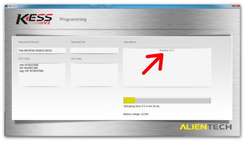 Pomocí zařízení KESS od firmy Alientech provedeme stáhnutí software z motorové řídicí jednotky po zásuvce OBD2.
