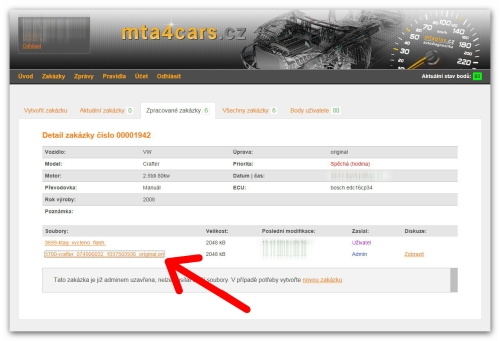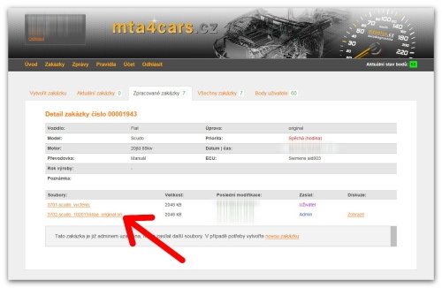 Po úspěšném vyčtení použijeme službu on-line systém mta4cars.cz pro zaslání originálního souboru. Zde je nutné uvést veškeré údaje o vozidle a přiložit vyčtený soubor.