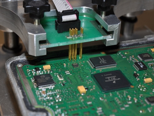 Pokusili jsme se vyčíst ECU mimo vozidlo, tzv. „na stole“. Bohužel ani tento pokus nebyl úspěšný. Museli jsme pro čtení/zápis použít servisní metodu po BDM rozhraní.